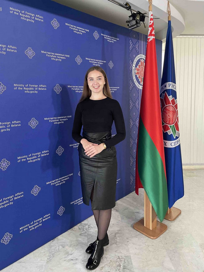 В апреле 2024 года я приняла участие в конкурсе Министерства иностранных дел «Хочу быть дипломатом». Конкурс был приурочен к 105-летнему юбилею современной белорусской дипломатической службы. В конкурсе принимали участие более 100 студентов белорусских ВУЗов, которые интересуются международными отношениями, внешней политикой и экономикой. Мне выпал уникальный случай побывать в Министерстве иностранных дел и увидеть где проходят важные переговоры с делегациями других стран и прочувствовать масштабы происходящих переговоров. Много интересного и запоминающегося. Очень запомнился музей артефактов, связанных с дипломатической службой министров. Один из интересных «сувениров»- это деревянный корабль с мачтами - подарок от посла Объединенных Арабских Эмиратов.